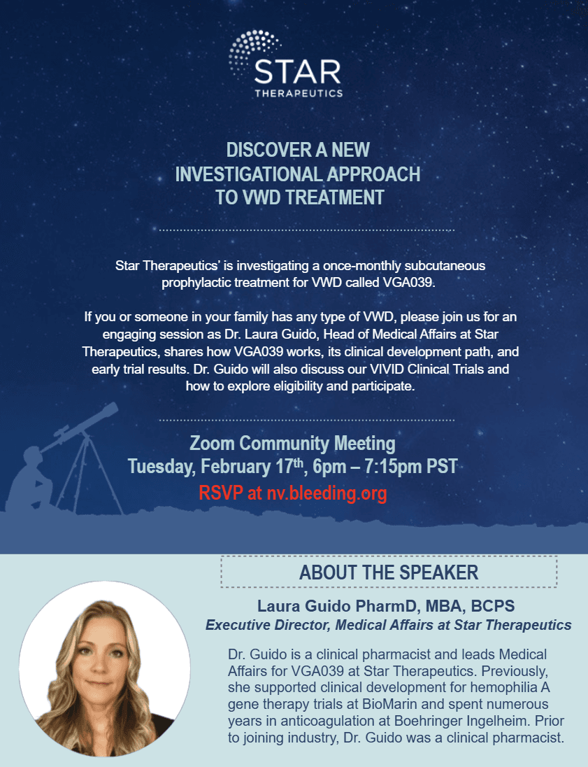 If you or someone in your family has any type of VWD, please join us for an engaging session as Dr. Laura Guido, Head of Medical Affairs at Star Therapeutics, shares how VGA039 works, its clinical development path, and early trial results. Dr. Guido will also discuss our VIVID Clinical Trials and how to explore eligibility and participate.