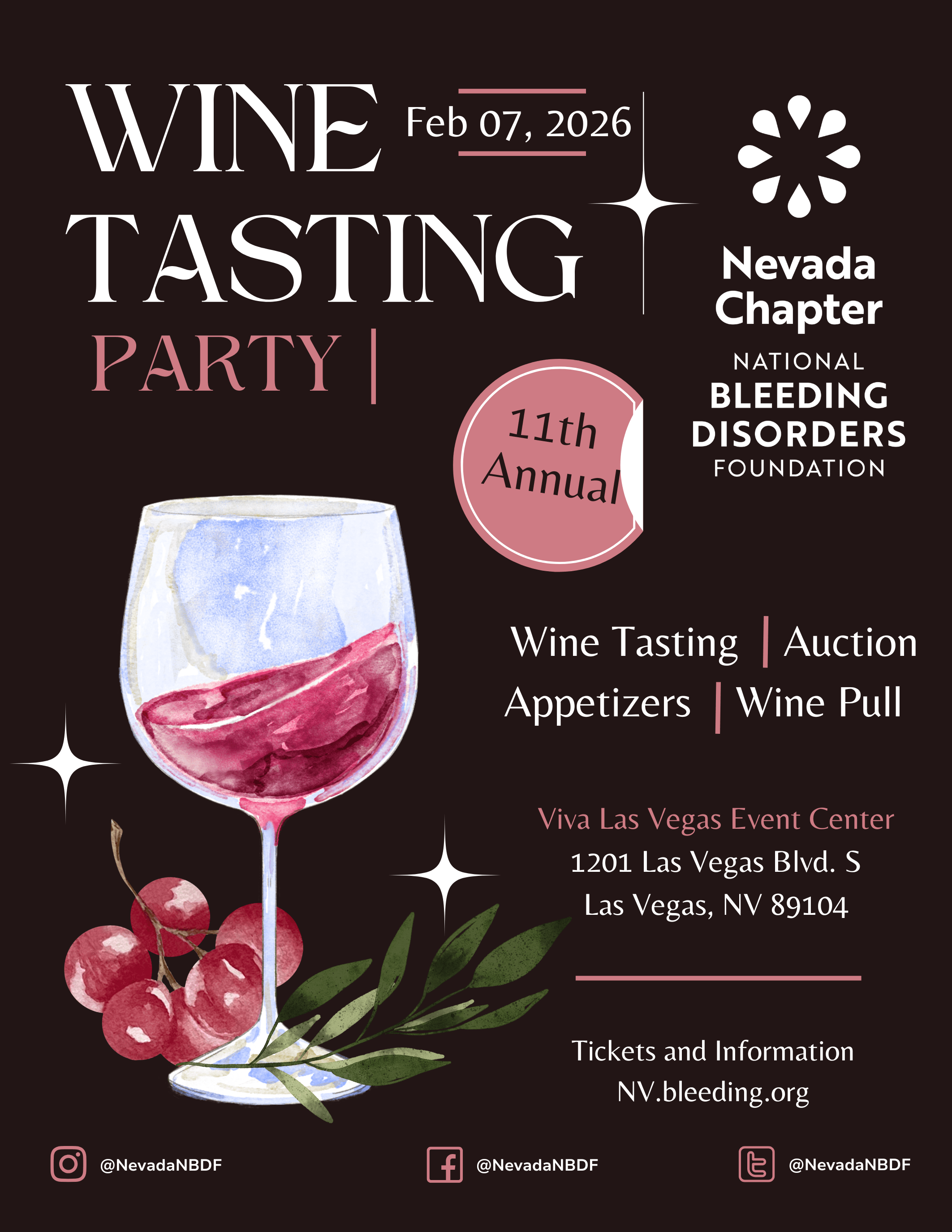 You are invited to sip, shop and support those with bleeding disorders at the Nevada Chapter's 10th Annual Winter Wine Fest. Join us in our new indoor location where festivities include an unlimited wine tasting, delicious hors d’oeuvres, an amazing silent auction, along with a wine pull and a DJ, all in a fun vintage Vegas setting at The Vegas Event Center in downtown Las Vegas.